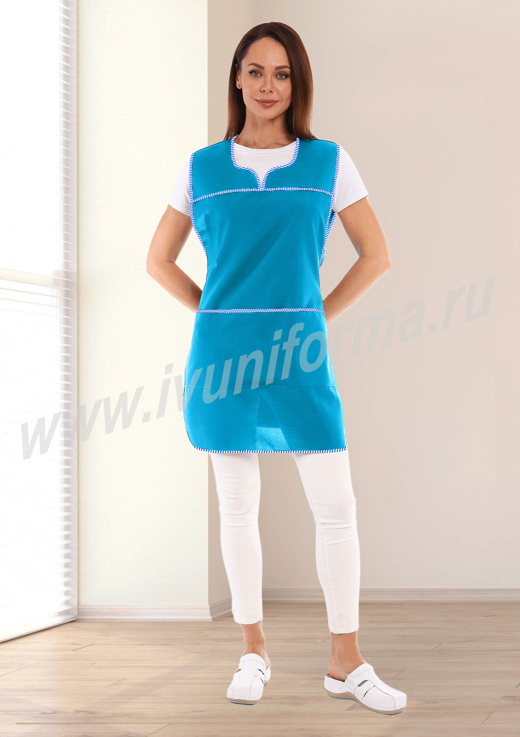 Фартук средней длины, перекидной, имеющий спинку без отделки и полочку с отрезными симметричными кокетками. В нижней части полочки расположены вместительные карманы. Объем талии фартука регулируется завязками – поясами. Все срезы фартука обработаны кантом из контрастной капроновой ткани. Фартук предназначен для защиты от общепроизводственных загрязнений.