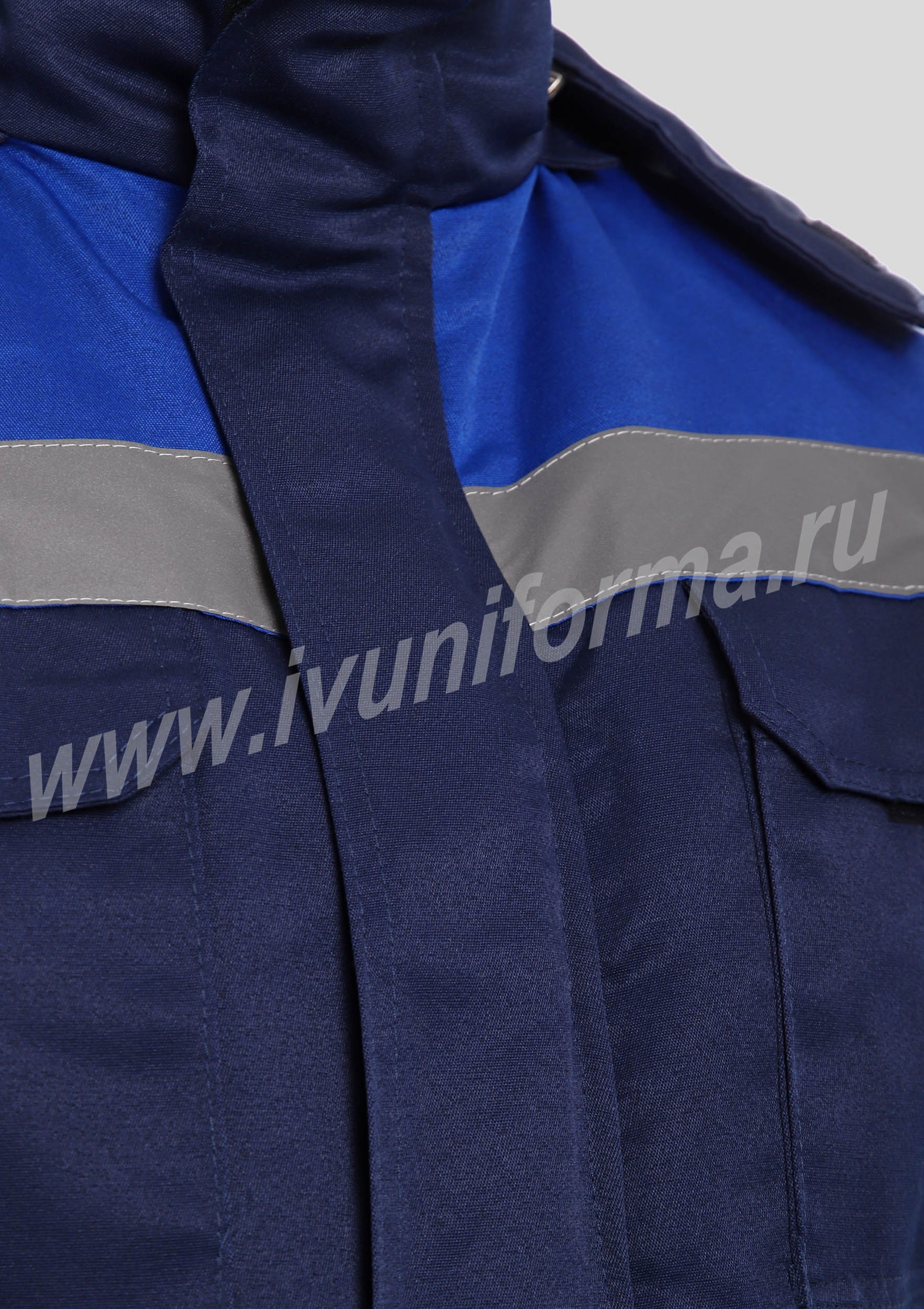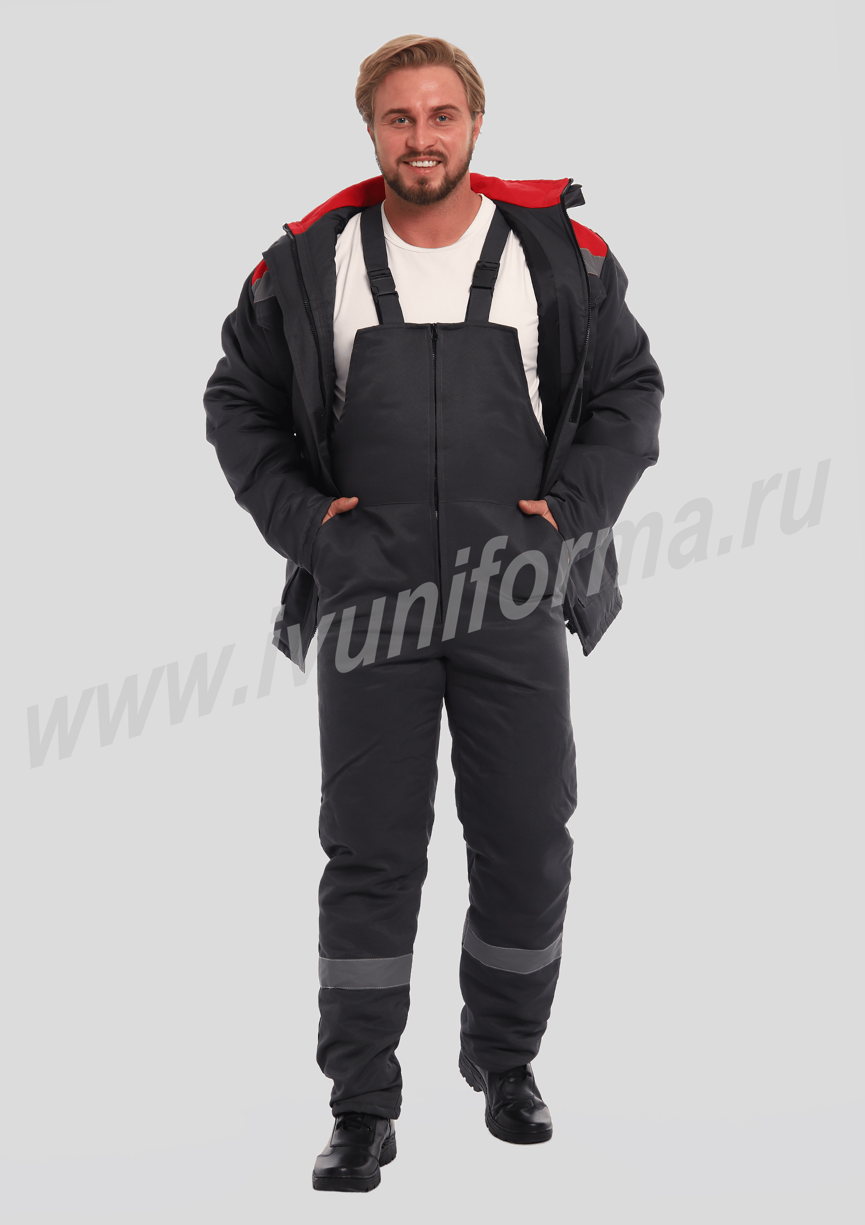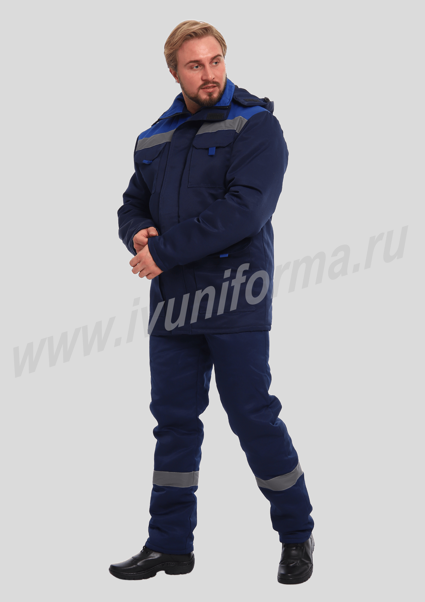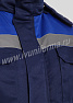 Костюм рабочий утепленный мужской состоит из куртки и полукомбинезона. Куртка удлиненная с воротником стойкой, прямого силуэта с застежкой на тракторную молнию с ветрозащитным клапаном на липучках "Velcro". На куртке два нагрудных и два нижних накладных кармана с клапанами и застежками на липучку "Velcro". Капюшон съёмный, на молнии ,с возможностью регулировки объема по лицевой части. Полукомбинезон прямого силуэта, с застежкой на две пуговицы и молнию. На брюках два передних кармана с косой линией входа. Однослойное утепление брюк объемом 200 гр/кв.м.